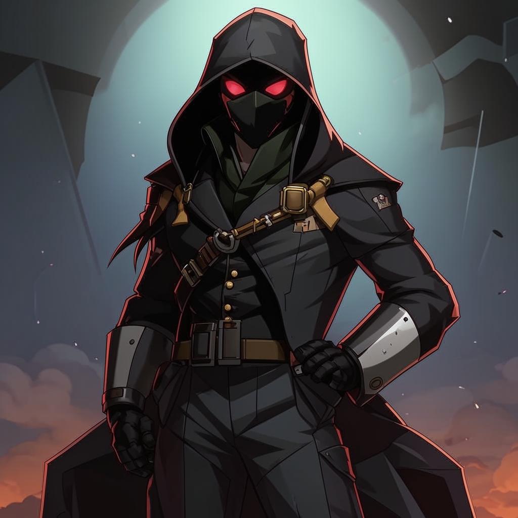 Одет в: Фиолетовый плащ с капюшоном, красные сапоги, патронные ремни 1 на поясе, 2 на теле в форме буквы Х.